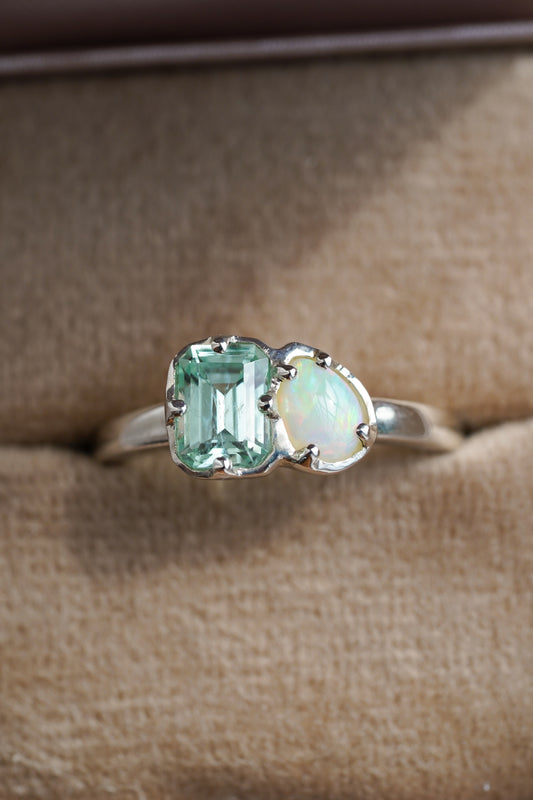 Seafoam tourmaline & white Australian opal Toi et Moi ring