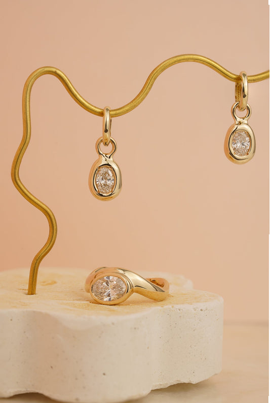 Inspired by the soft glow of the golden hour — where sunlight lingers and everything is bathed in a gentle radiance. Each piece captures that fleeting moment of calm and beauty. Crafted in solid gold and set with champagne zircons and diamonds - designed to be worn daily and treasured for a lifetime.