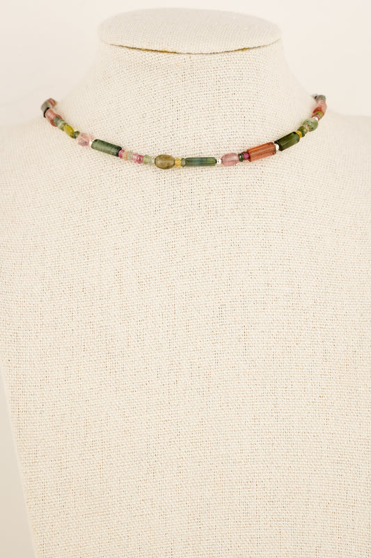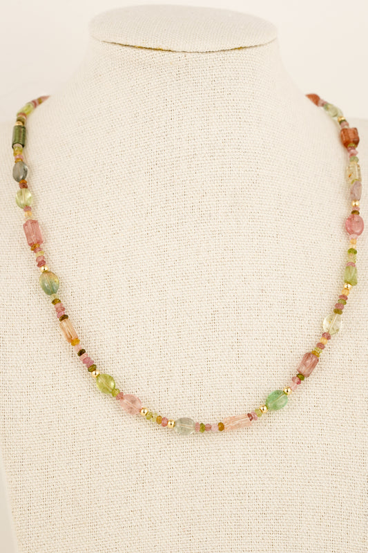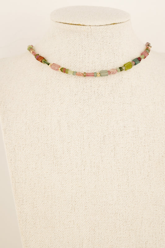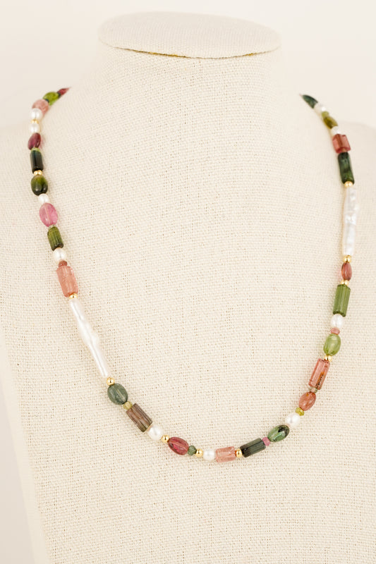 Mixed tourmaline & biwa pearl beaded necklace - gold