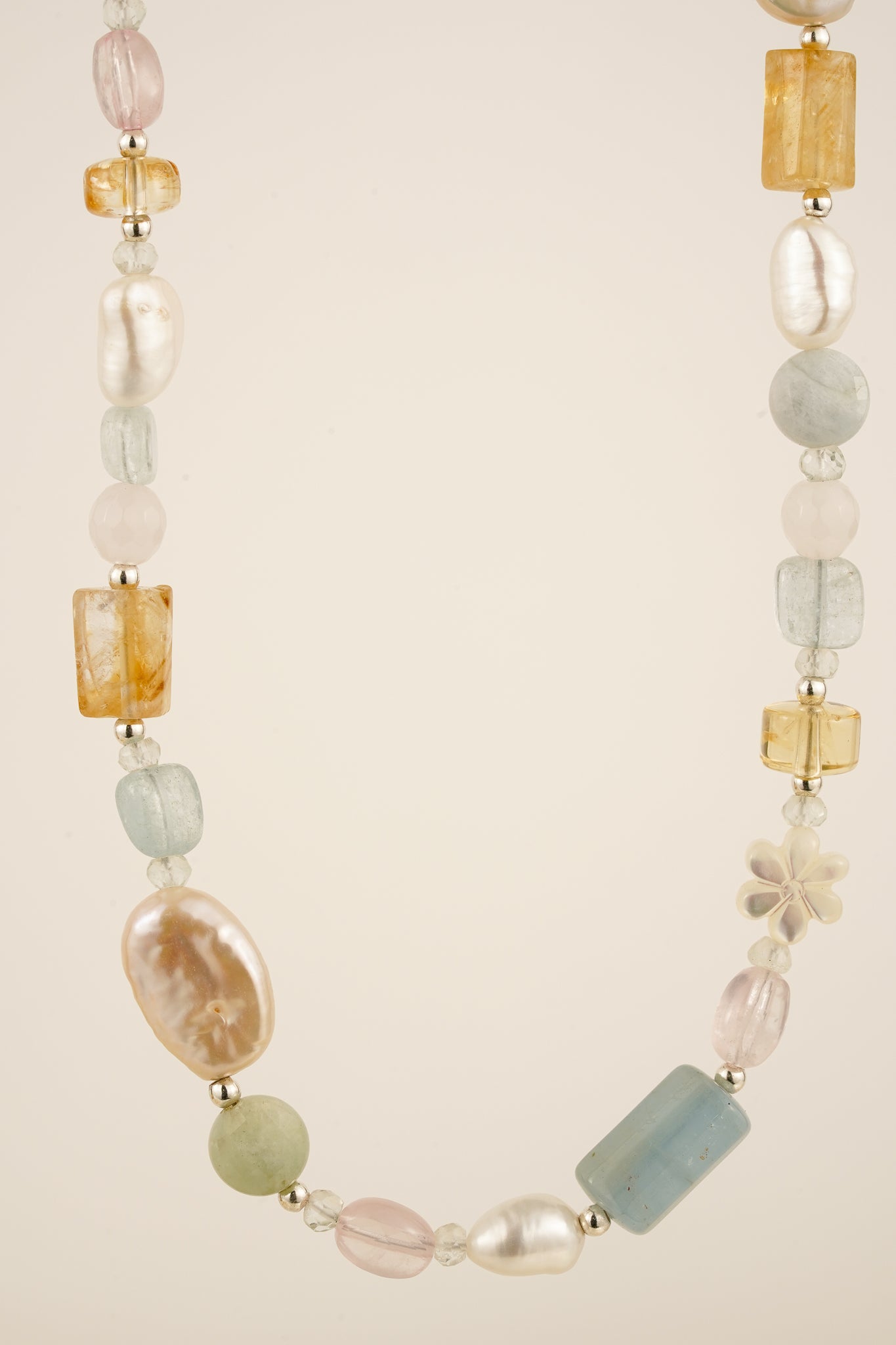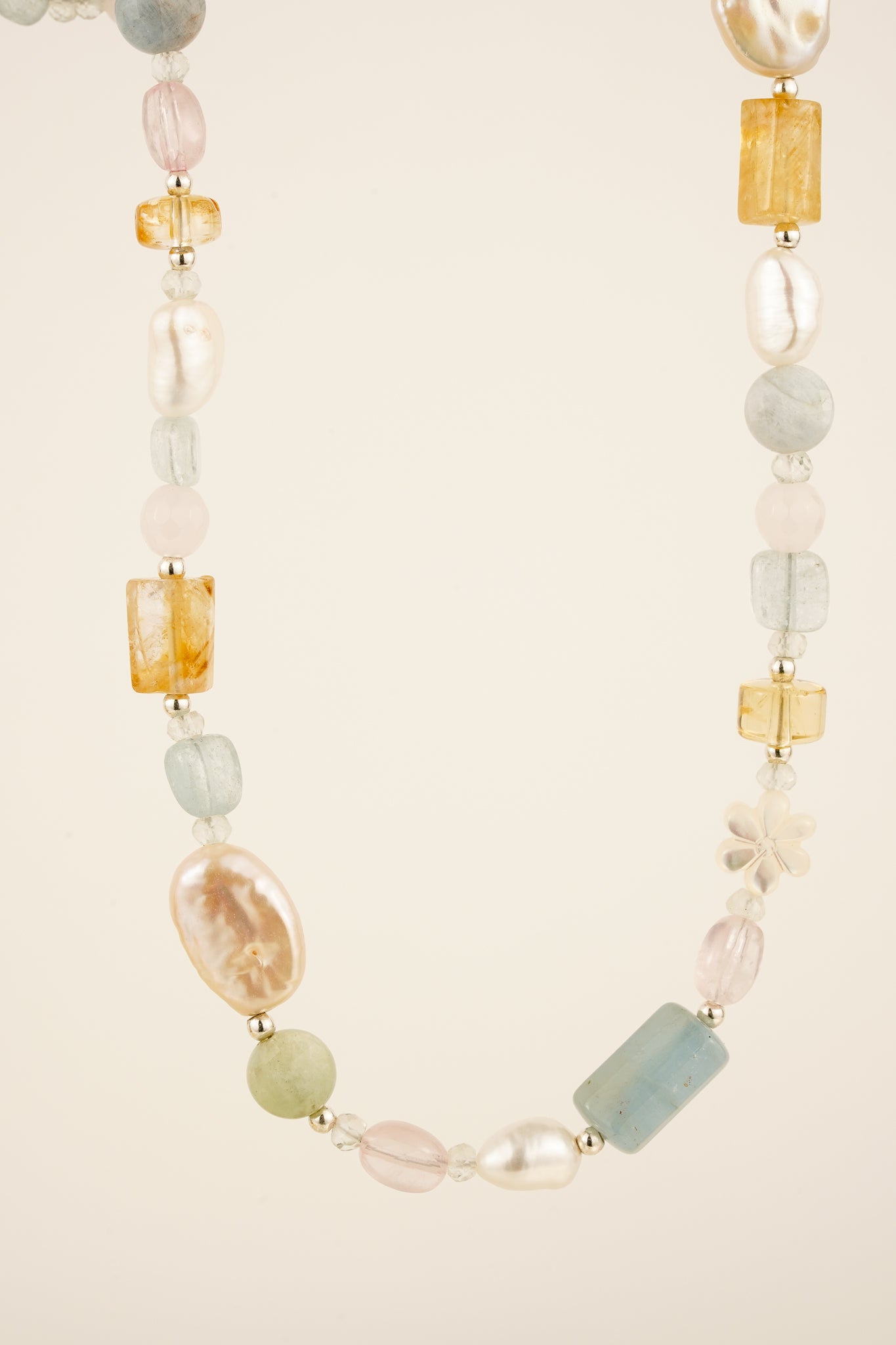 This beaded necklace features a mix of natural gemstones - aquamarine, citrine, morganite and freshwater pearl.