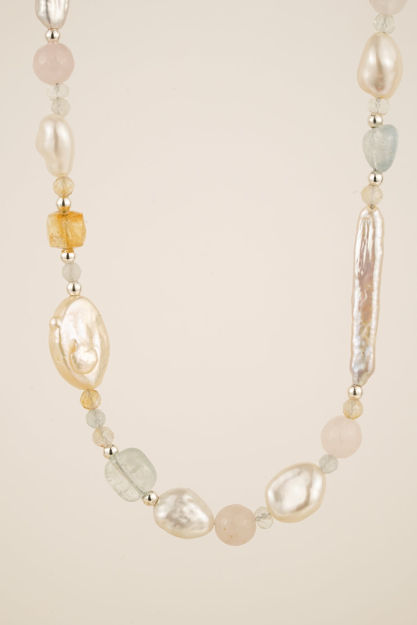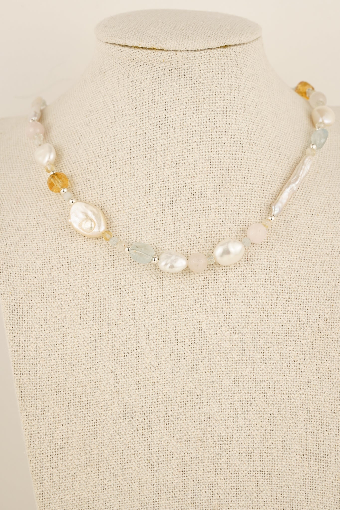 This beaded necklace features a mix of natural gemstones - aquamarine, citrine, morganite and freshwater pearl.