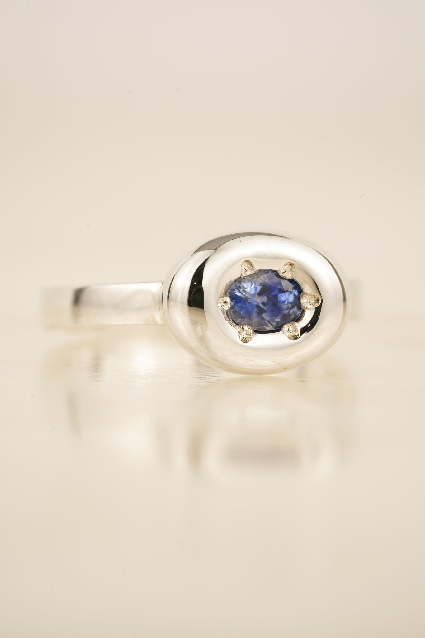 This east-west style ring holds a lovely bright blue Ceylon sapphire.