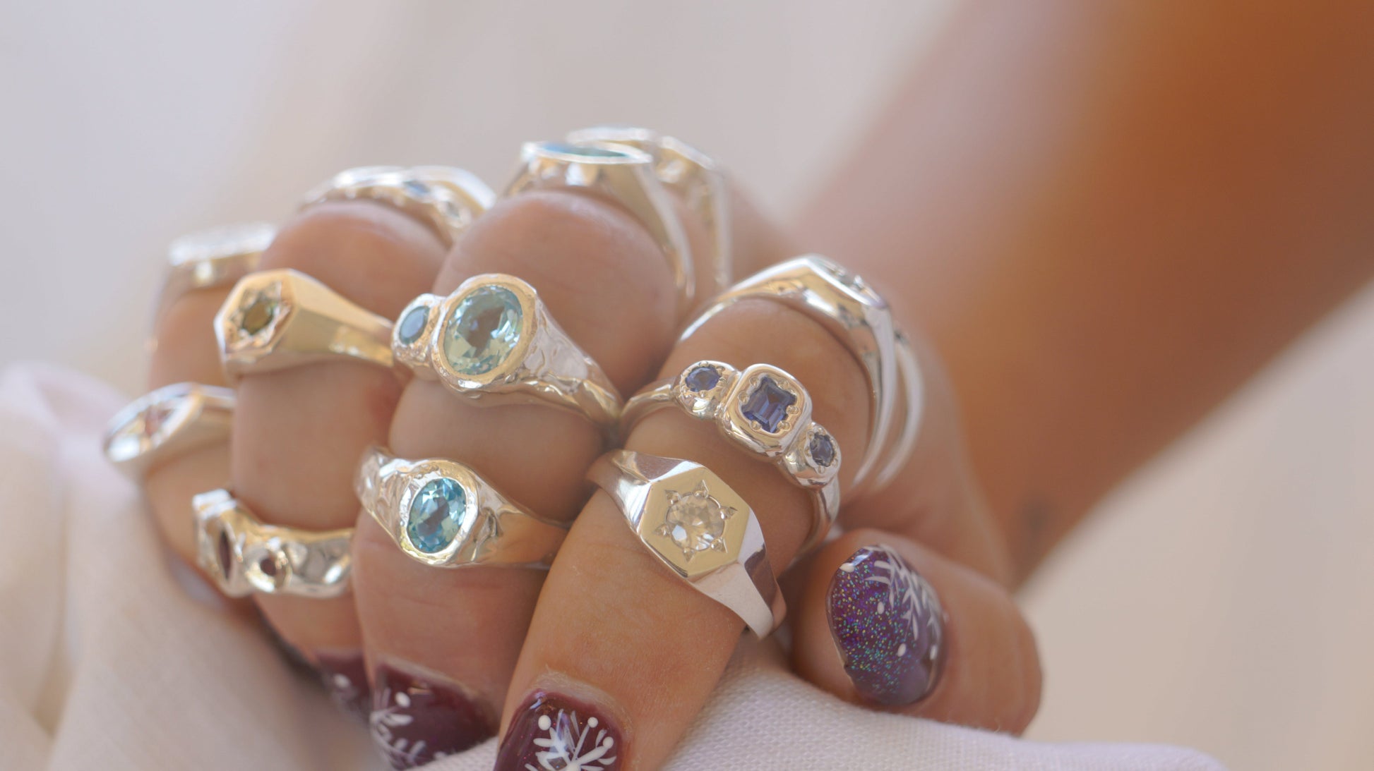 This solid sterling silver ring features two natural light blue topaz gemstones. The ring was handmade using the lost wax casting technique and has a molten texture on the band and a sparkly hammered texture around the stones.