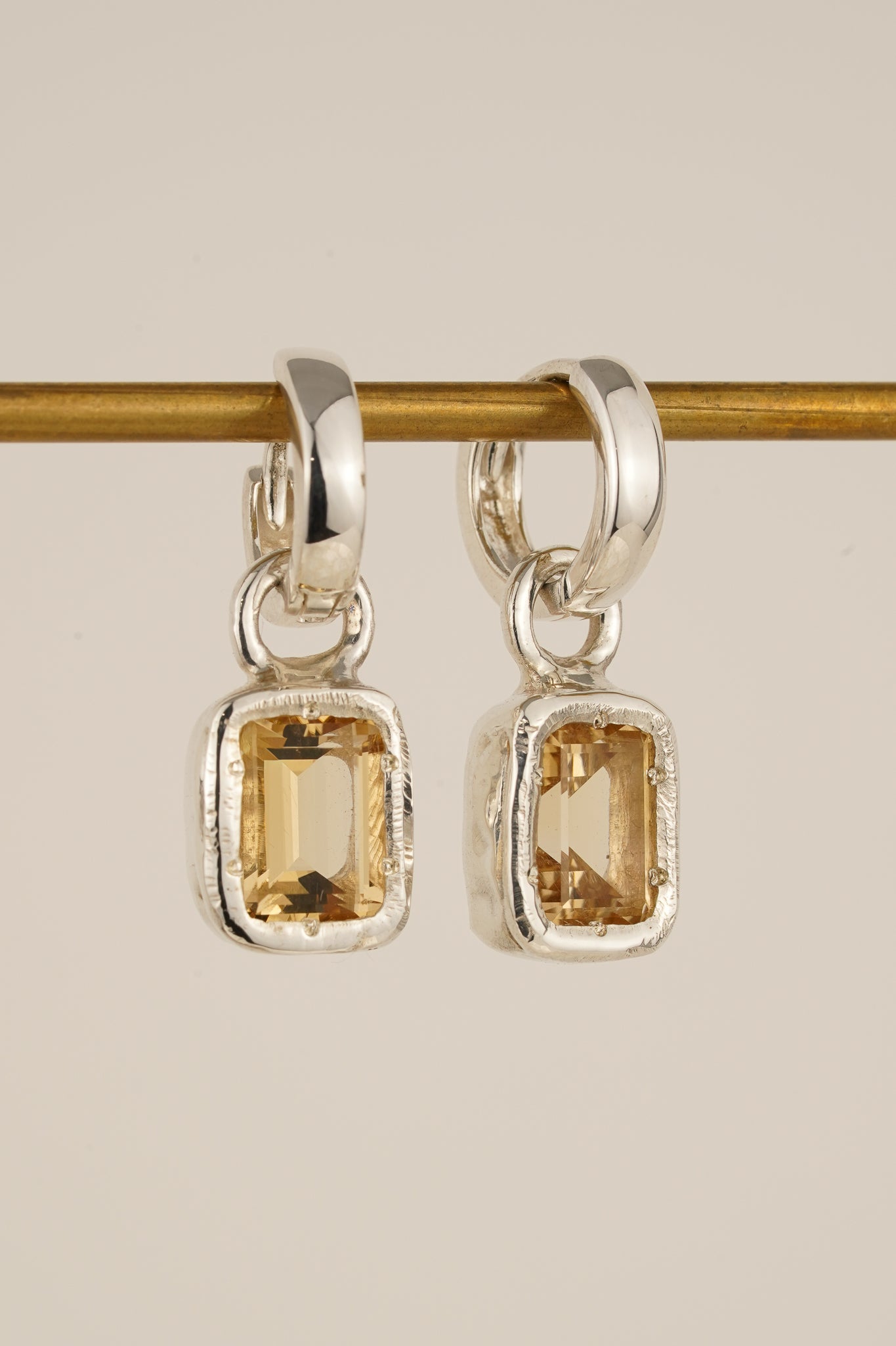 These earring charms feature a stunning pair of natural emerald cut champagne quartz and a textured bezel setting. The quartz gemstones have a lovely golden honey tone. These pair well with mixed zircon beaded necklaces, for a cohesive look.