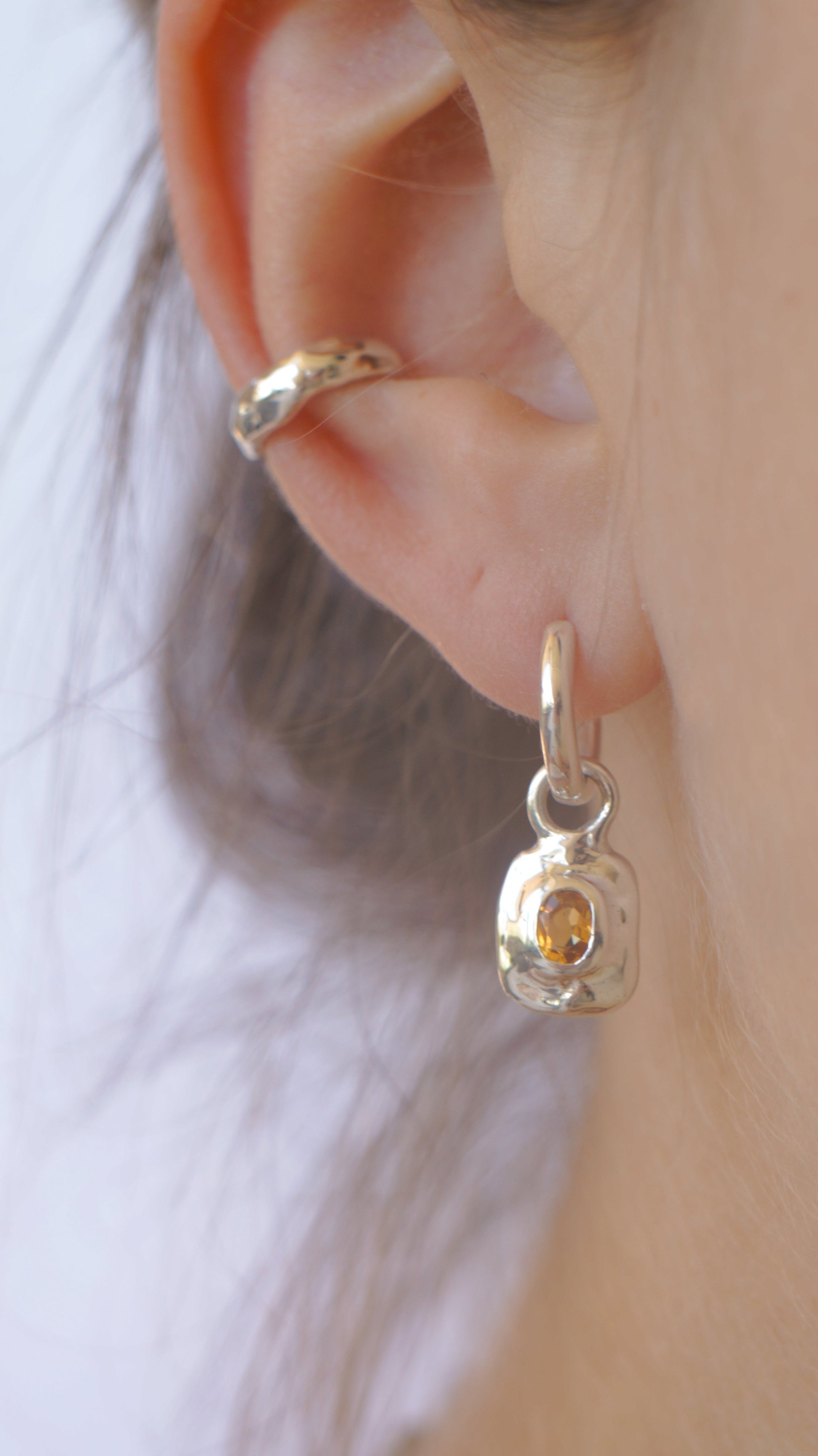 These handmade sterling silver earring charms feature bezel-set natural citrine gemstones and a organic rectangular shape. Huggies are included.