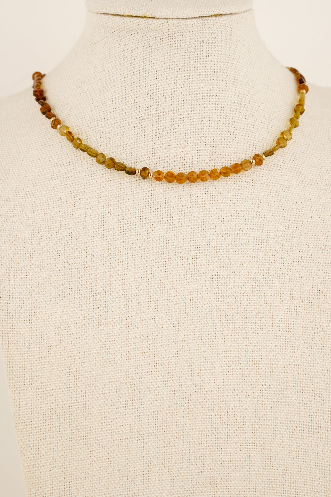 This beaded necklace features natural coin-shaped petro tourmaline beads in and ombre pattern. Warm, earthy and neutral tones of orange and green. Pairs perfectly with gold chains and pendants containing opal and tourmaline.