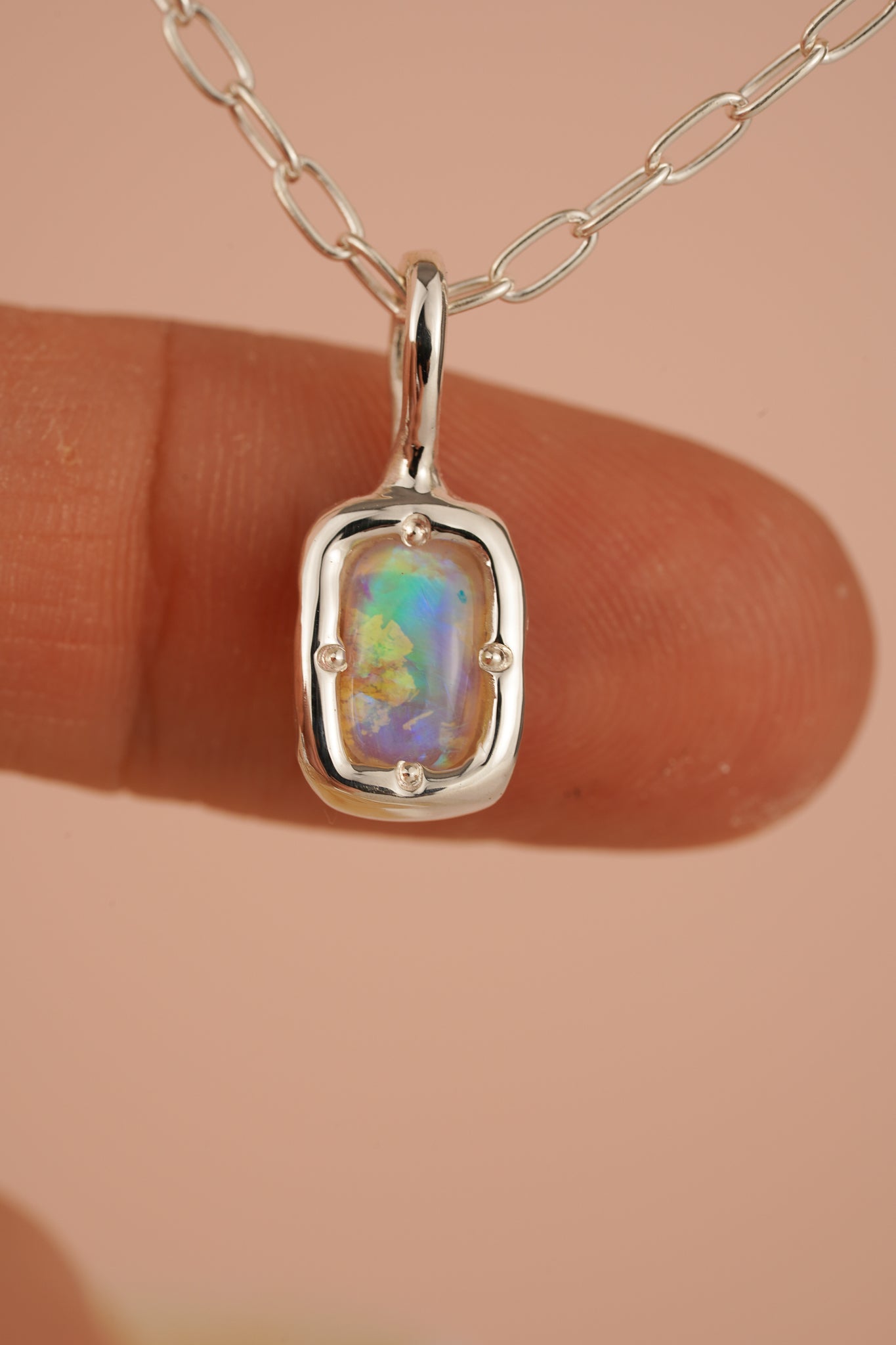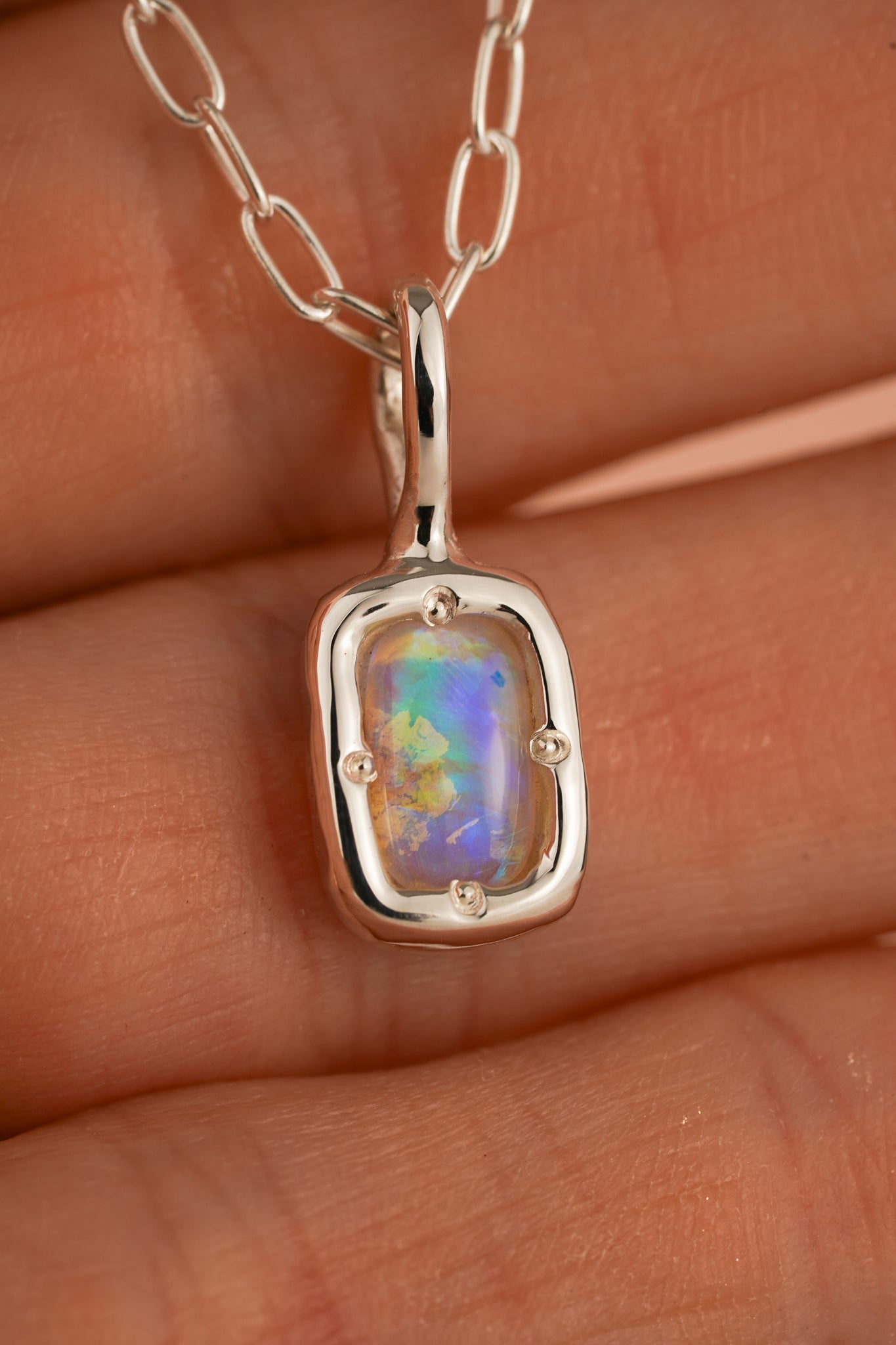 This pendant features a bright rectangular crystal opal from Lightning Ridge, Australia. The opal displays bright flashes of blue, green and purple - depending on the angle. The colour is much brighter when worn against the skin and also in direct sunlight.