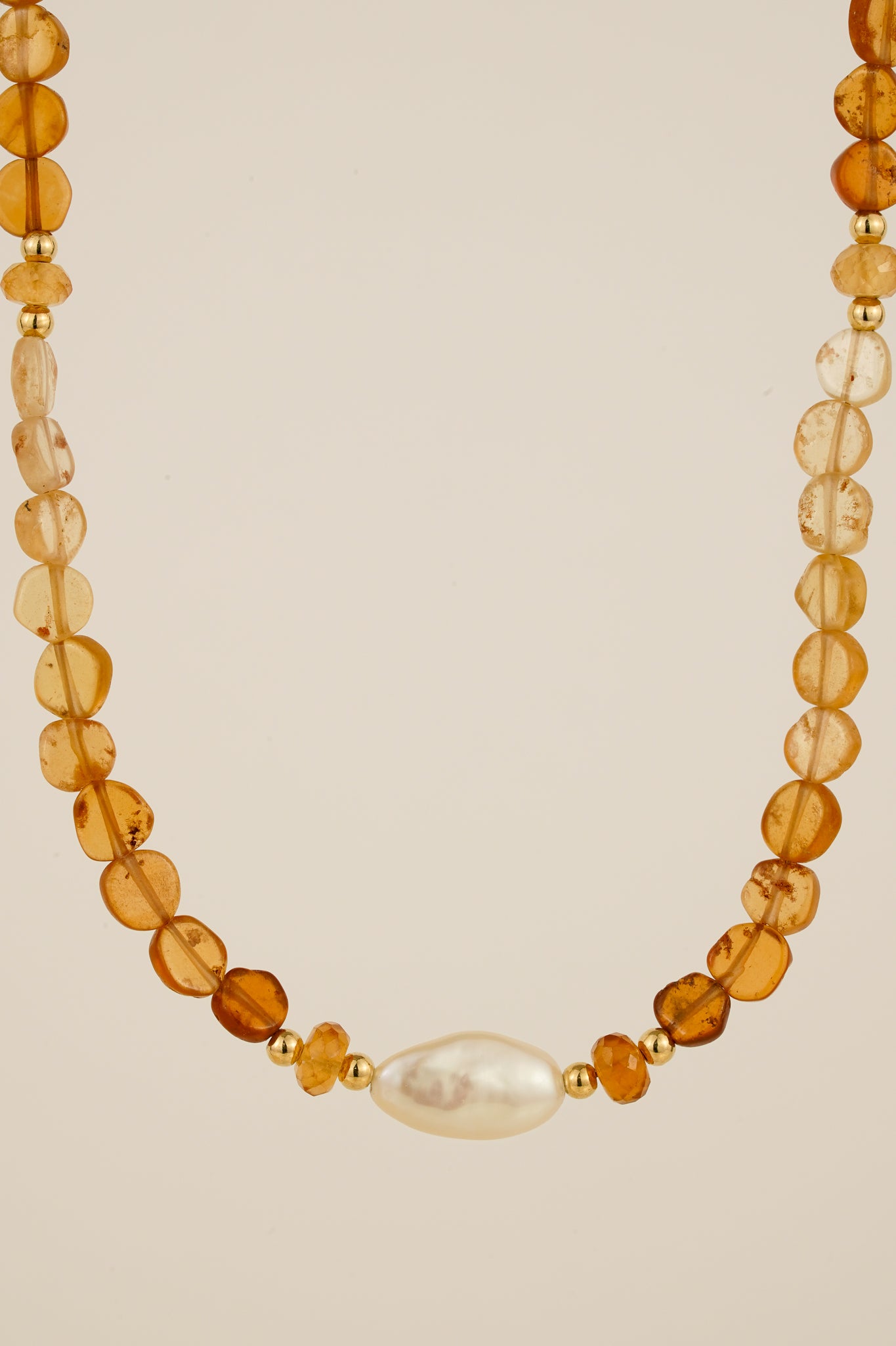 This beaded necklace features natural garnet coin shaped gemstones in an ombre pattern with a freshwater pearl centrepiece. Pairs perfectly with gold chains and pendants.