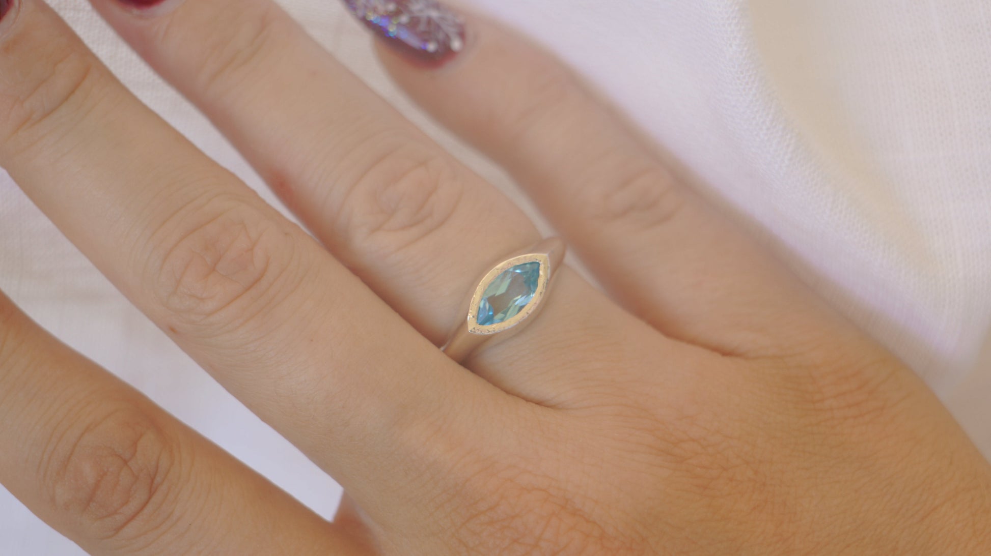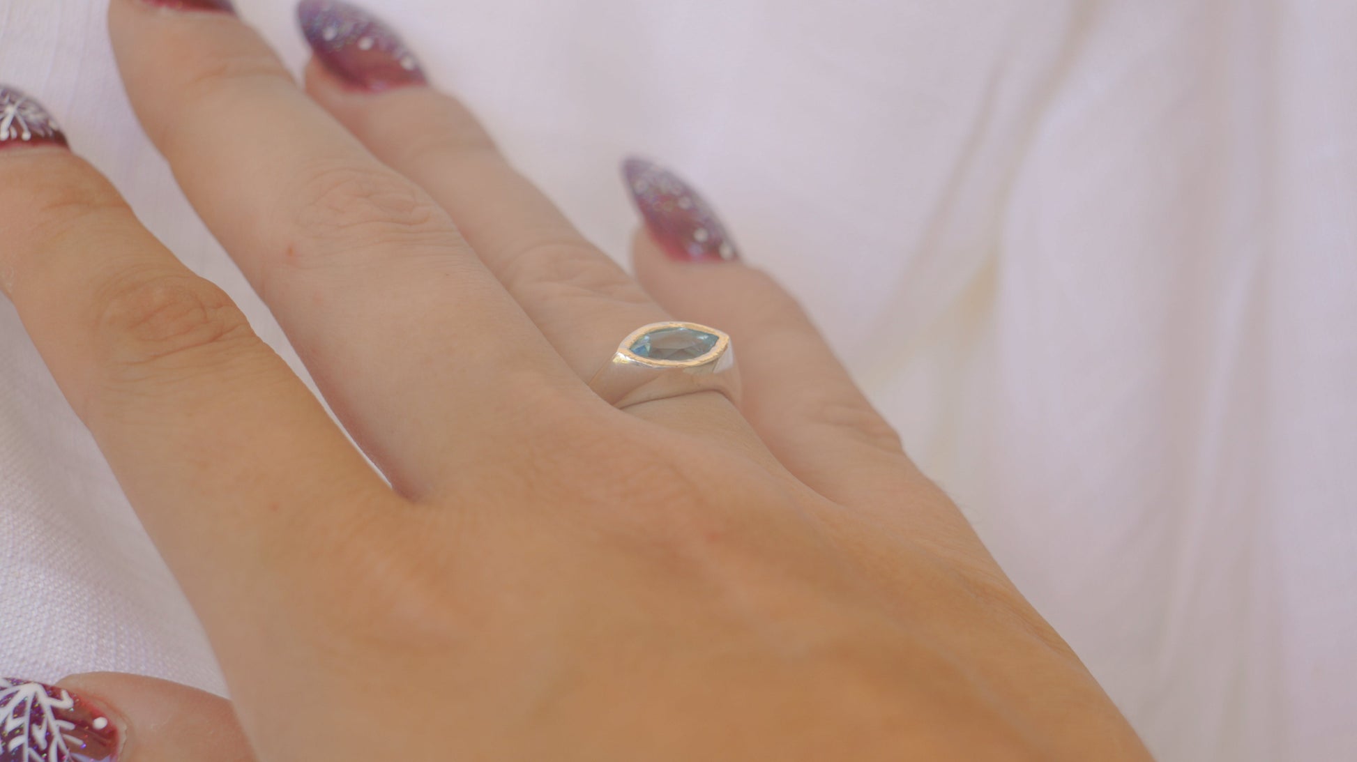 This solid sterling silver ring features a large natural mid-blue marquise topaz gemstone. The band is smooth, with a knife edge detail on the shoulders.