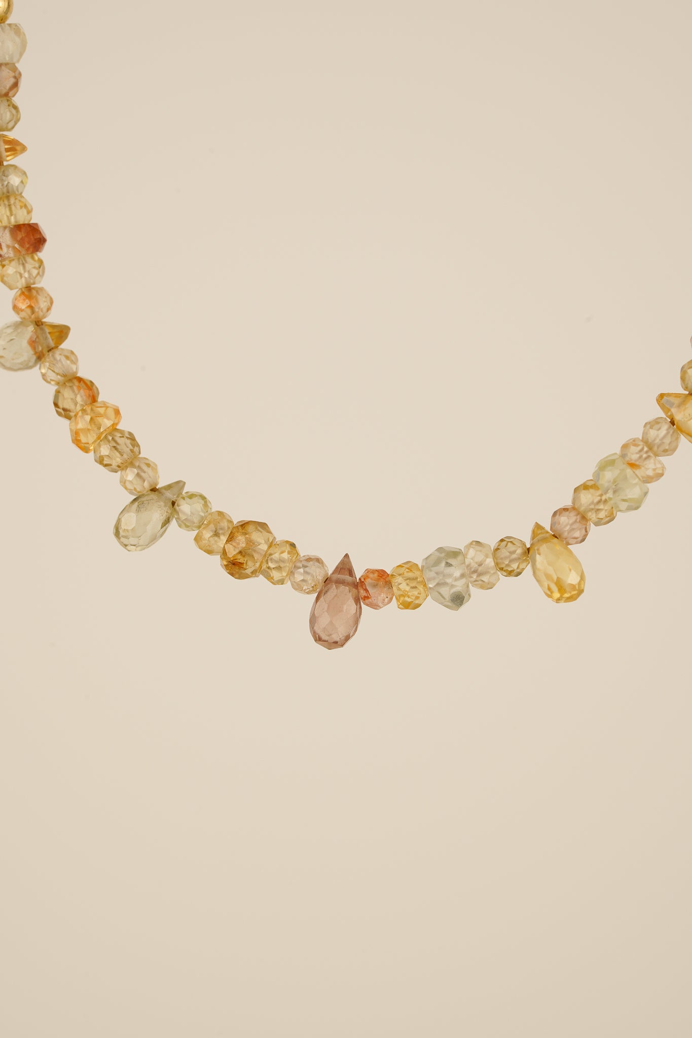 This beaded necklace features hand-faceted natural zircon gemstones in various earthy/neutral shades of champagne, brown, green and yellow. Incredibly sparkly, especially in the sun. Pairs perfectly with gold chains and pendants.