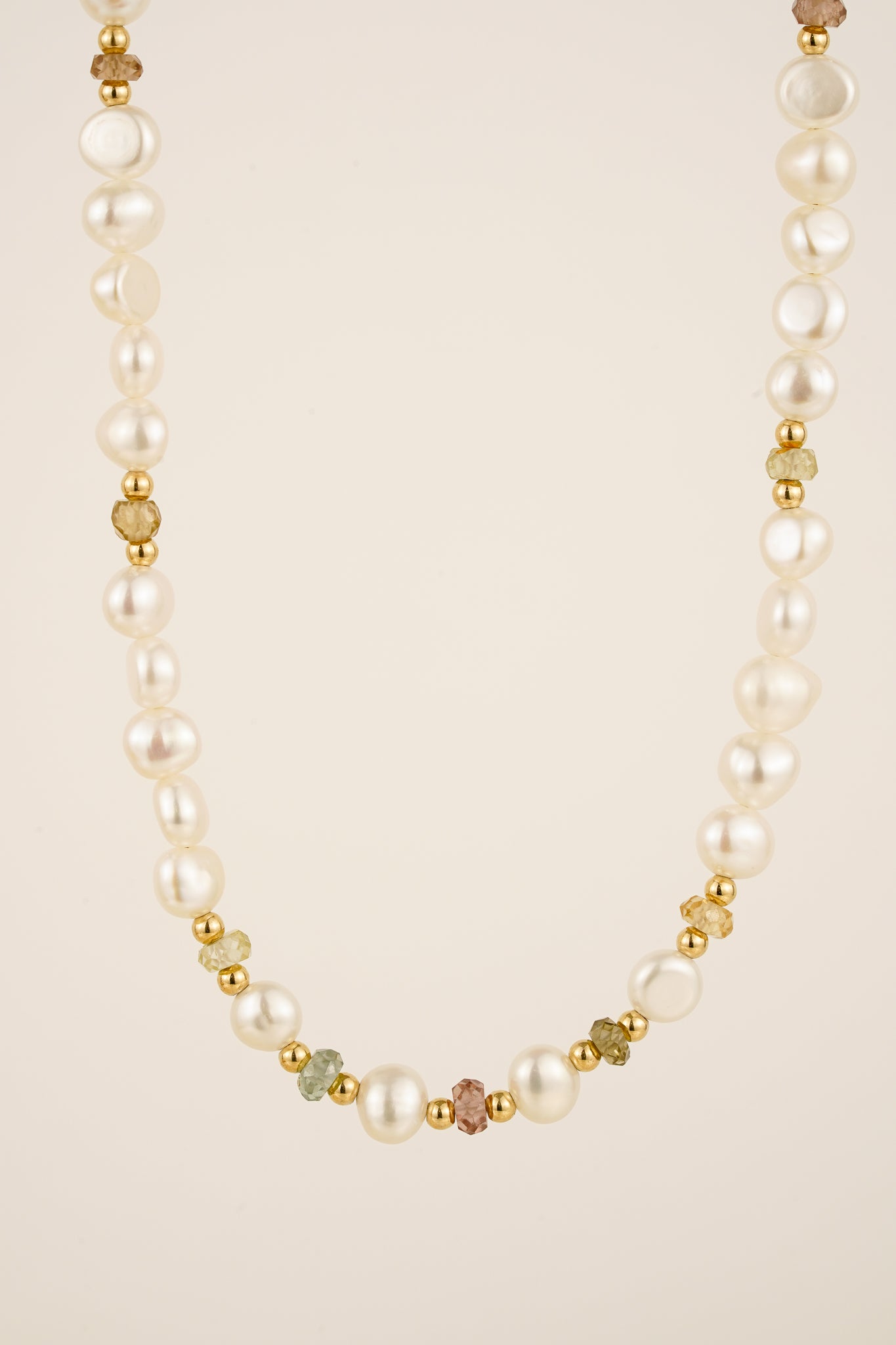 This beaded necklace features a mix of natural zircon and freshwater pearl gemstones. Pairs perfectly with gold chains and pendants.