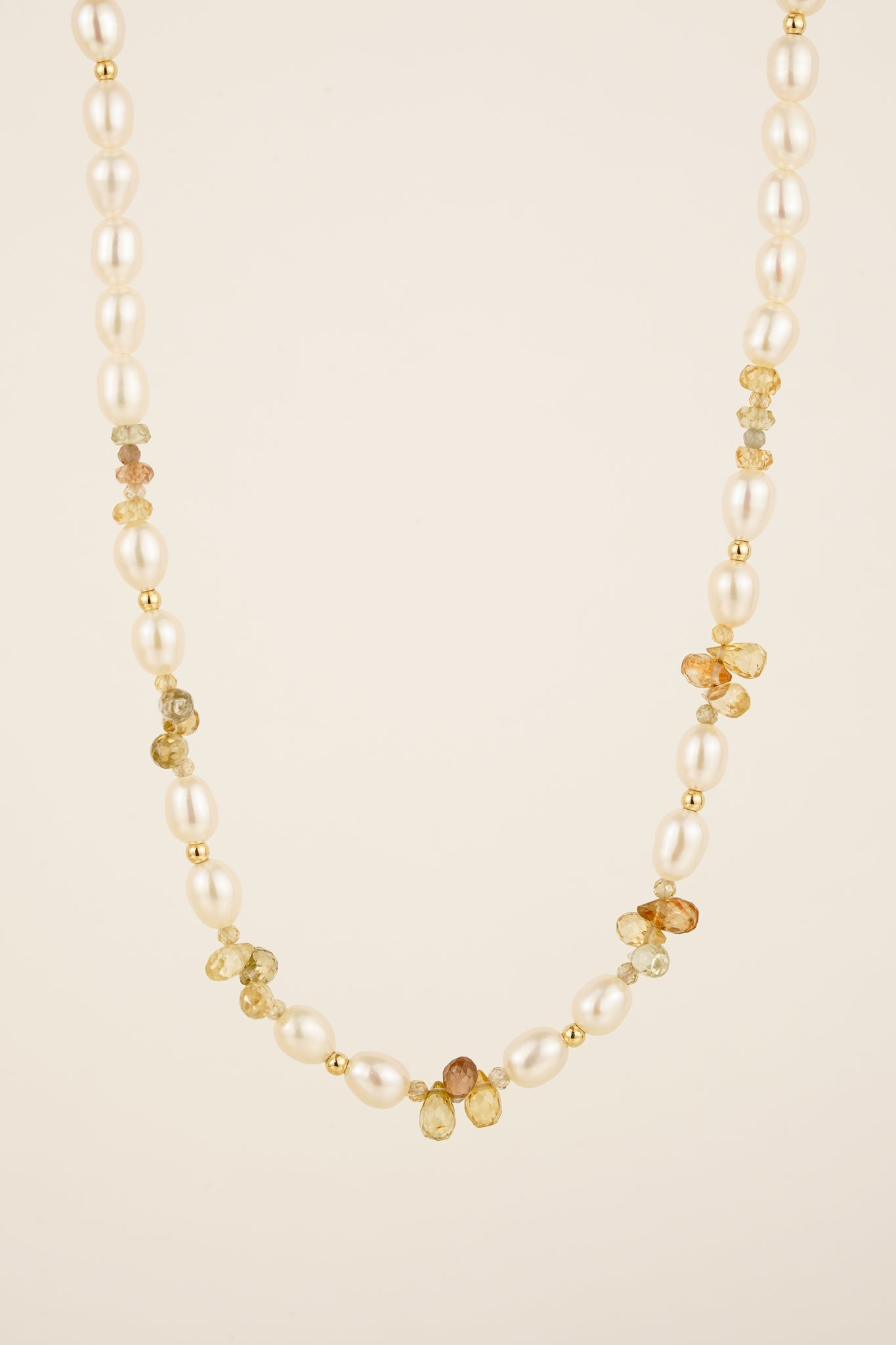 This beaded necklace features a mix of natural zircon and freshwater pearl gemstones. Pairs perfectly with gold chains and pendants.