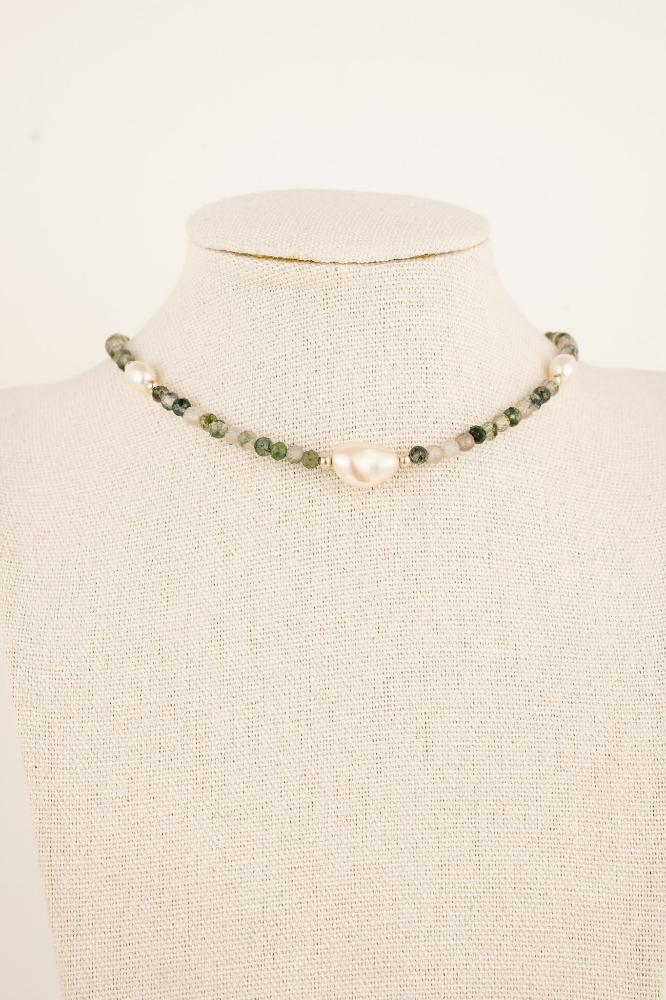 This beaded necklace features natural moss agate gemstones in various shades green & freshwater pearls. Pairs perfectly with silver chains and pendants.