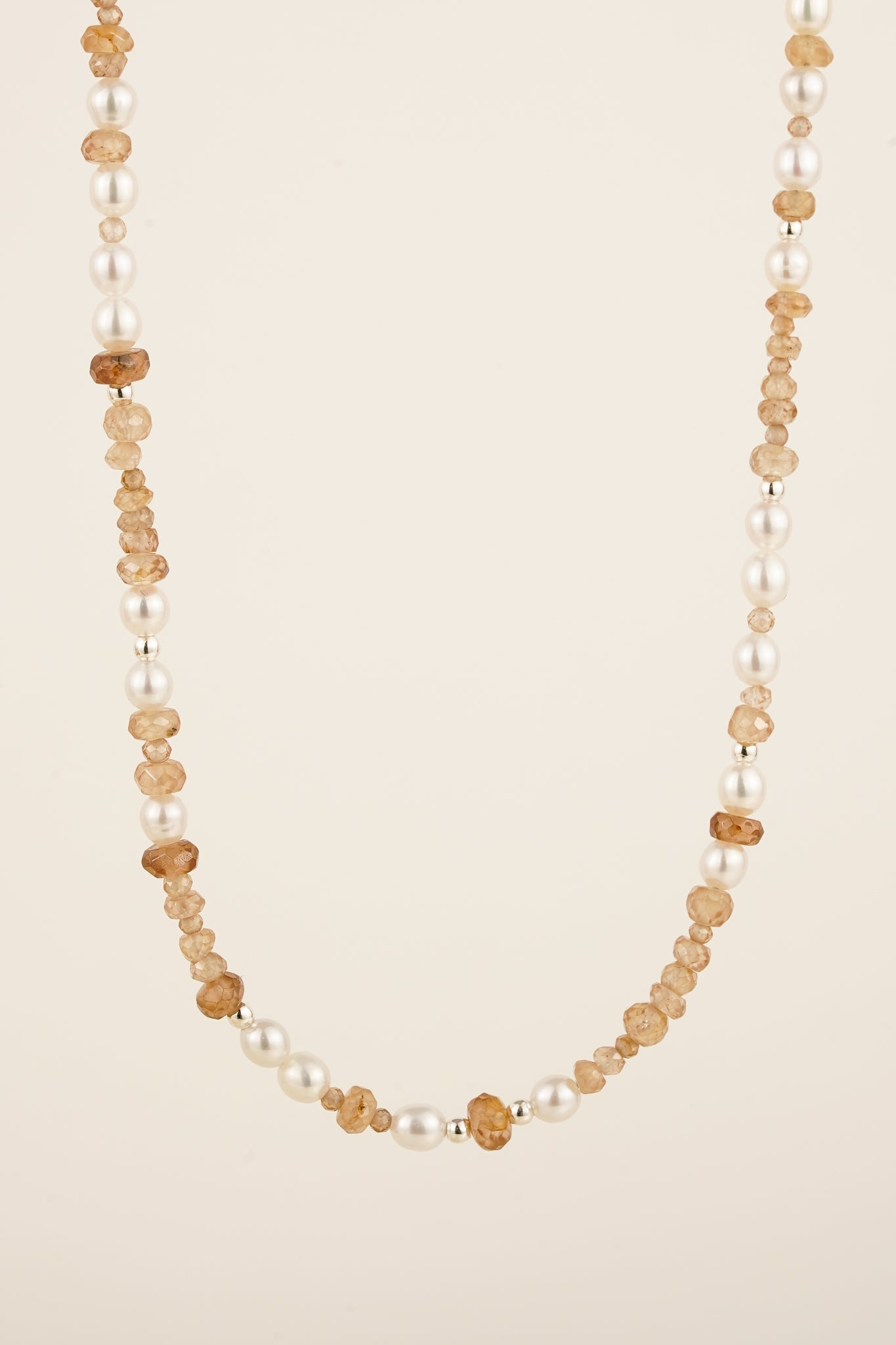 This beaded necklace features a mix of natural pinkish champagne/brown zircon gemstones and freshwater pearls . Pairs perfectly with gold chains and pendants.
