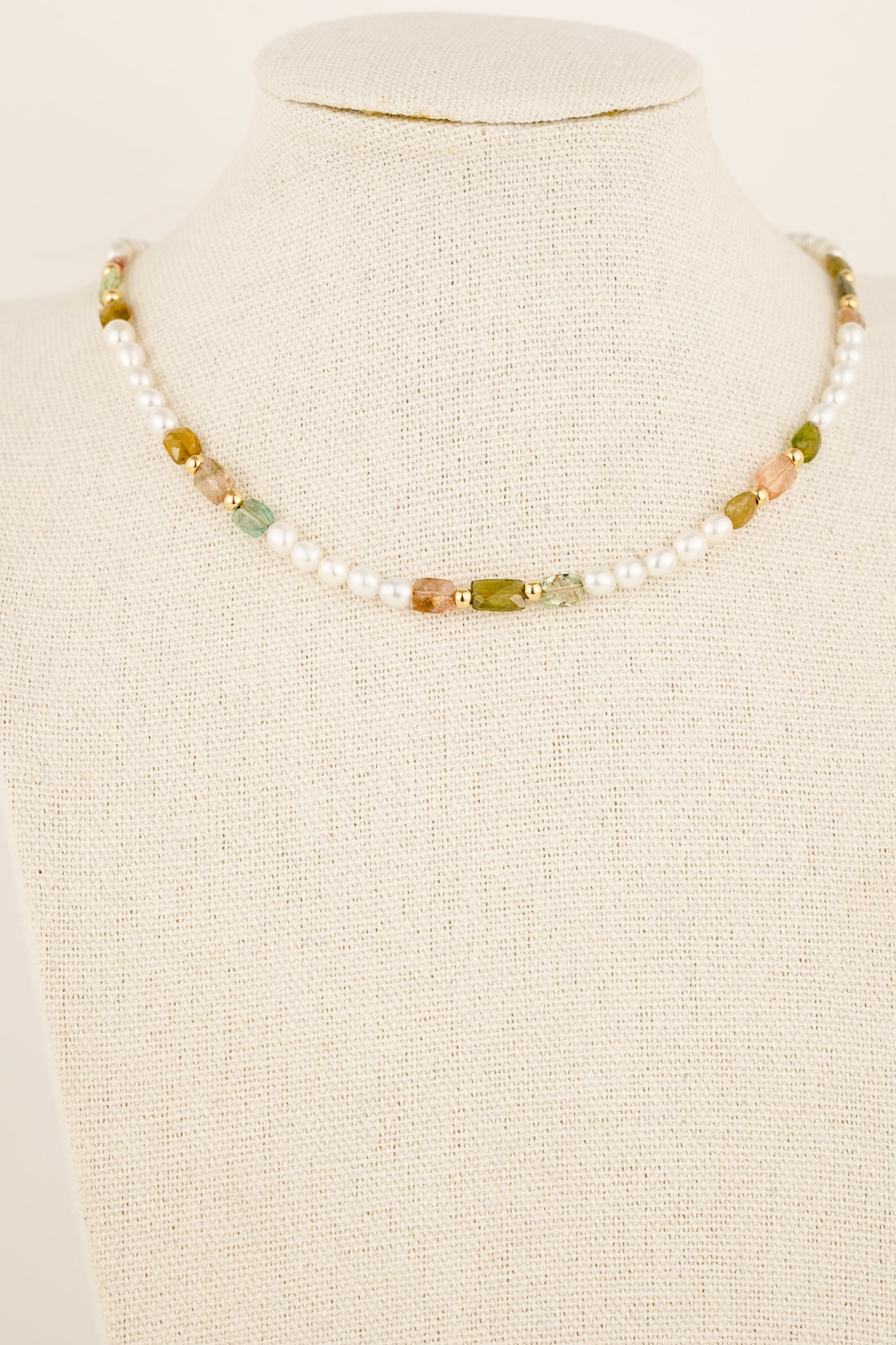 Pearl & cushion cut tourmaline beaded necklace - gold