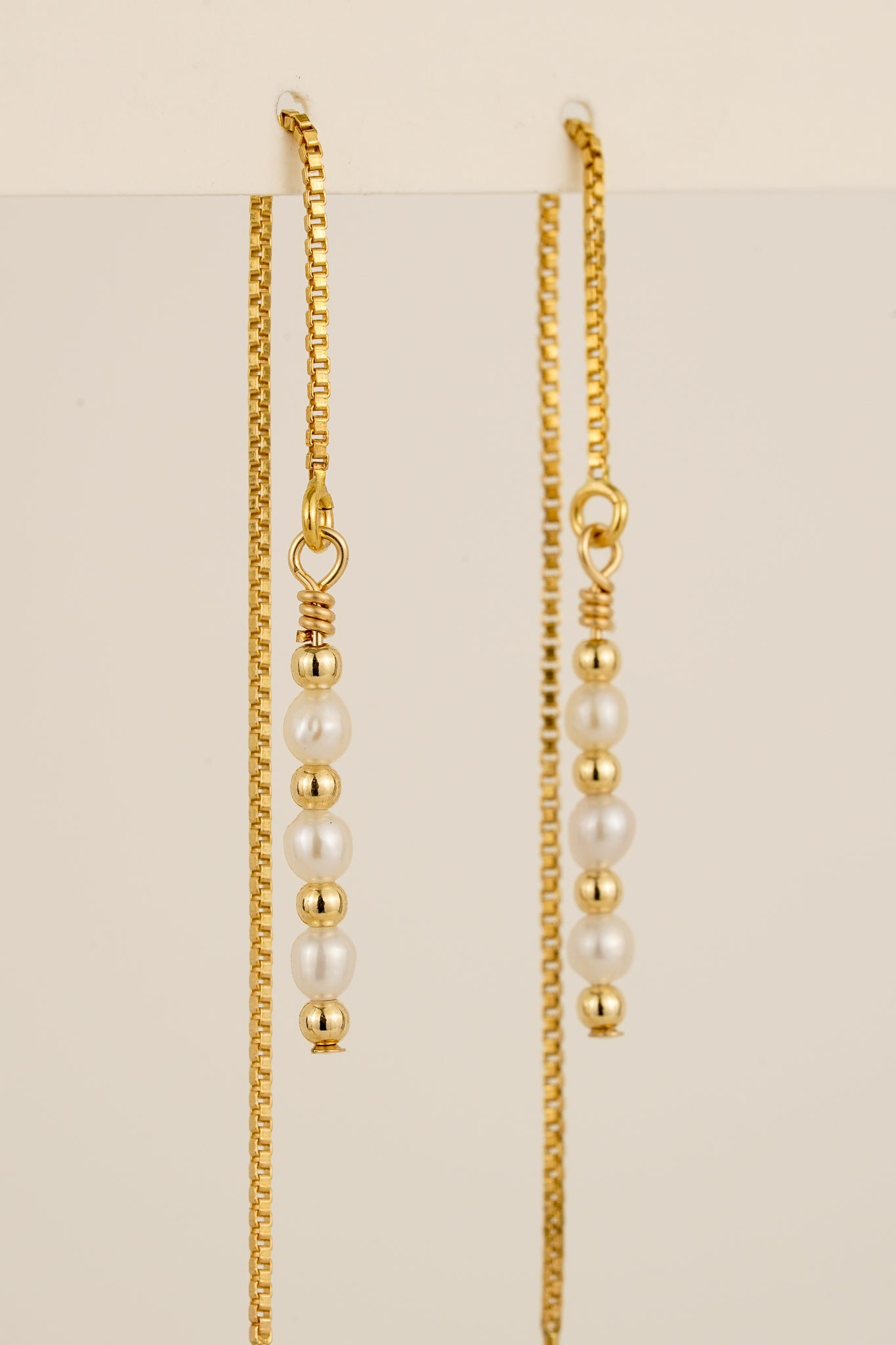 These handmade earrings feature tiny natural white freshwater pearls and round gold-filled beads. The pearls hang on a fine box chain threader - extremely comfortable and adds lots of movement.