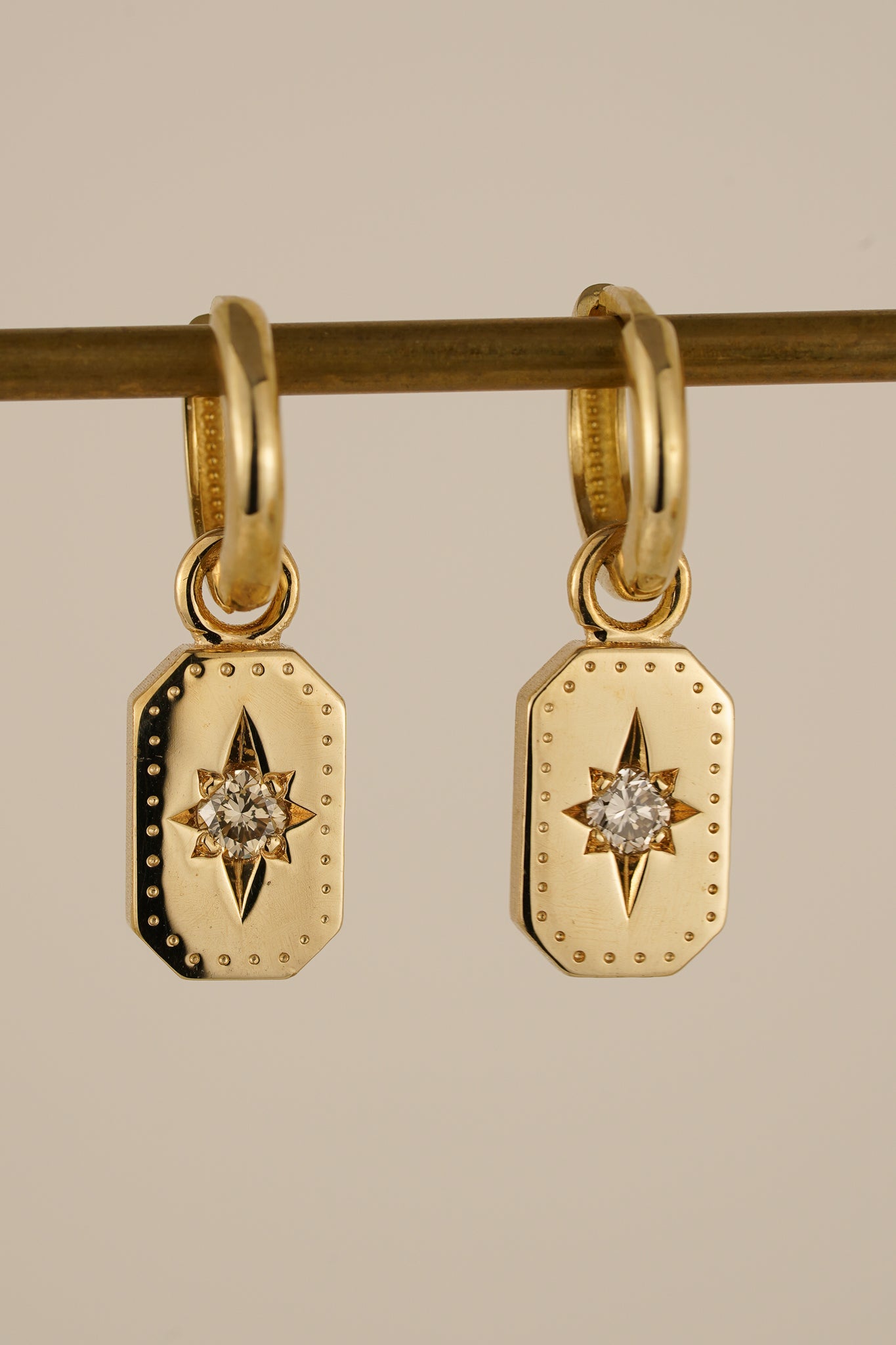 Simple & elegant earring charms that go with everything. Finished with high polish and hand-stamped dots that catch the light. Each charm contains a 2.7mm star-set natural champagne diamond. The diamonds have a beautiful warm colour in person, which was difficult to capture in photos. Please get in touch if you'd like a video of these stunning charms