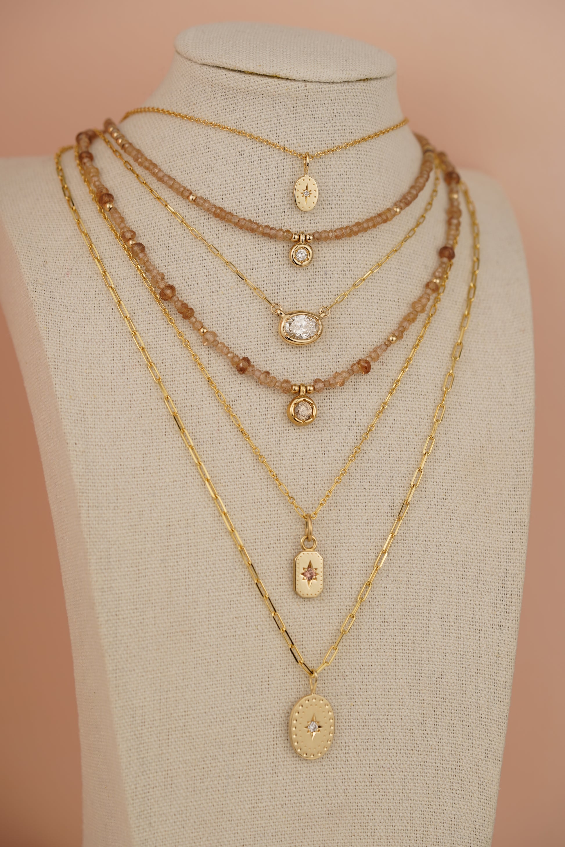 This necklace features a natural diamond pendant within a strand of natural champagne zircon beads. Dainty, minimal and neutral - perfect for layering with other gold pendants and chains. The zircon beads are hand-faceted to create a more organic feel and are incredibly sparkly in sunlight.
