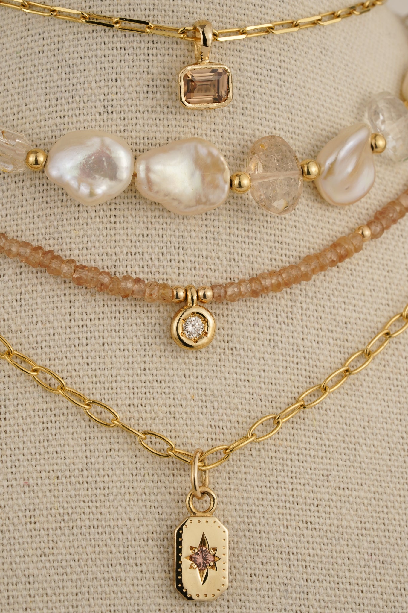 This pendant features a stunning emerald cut natural zircon - the perfect tone between champagne, brown and pink. Layers perfectly with champagne zircon beaded necklaces, diamonds, pearls and peach sapphires.