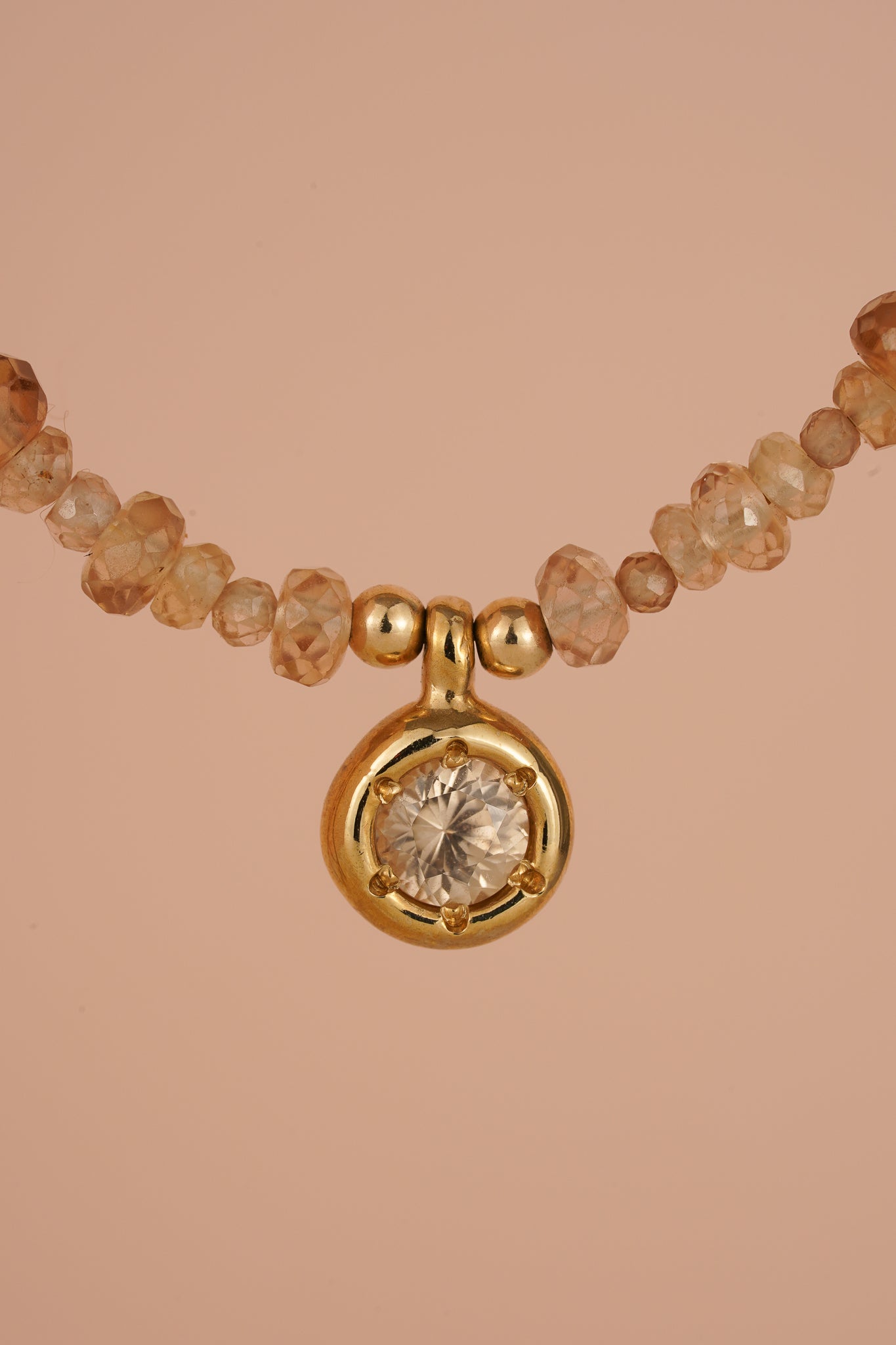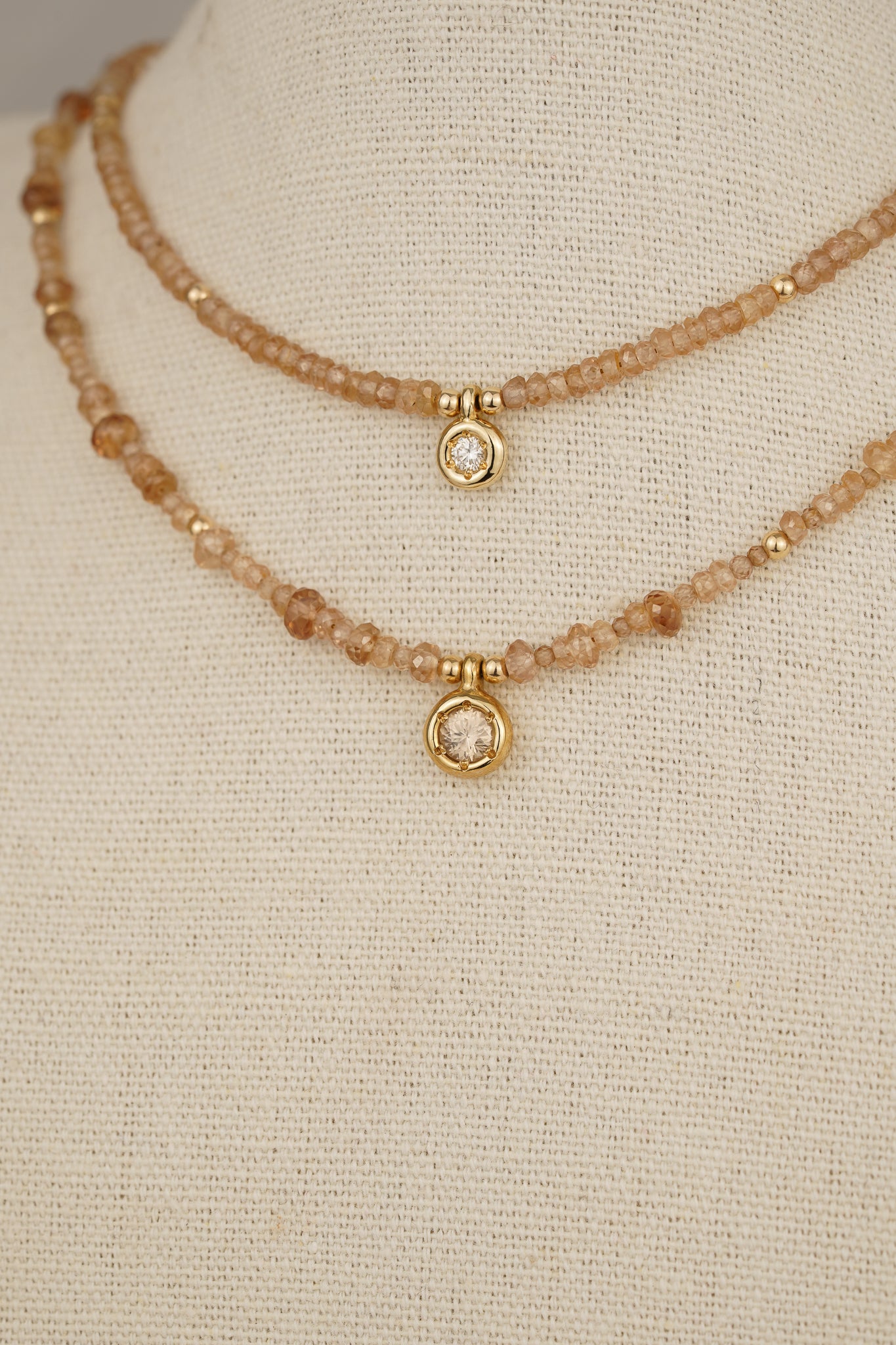 This necklace features a natural pinkish-champagne zircon pendant within a strand of mixed natural champagne and brown zircon beads. Dainty, minimal and neutral - perfect for layering with other gold pendants and chains. The zircon beads are hand-faceted to create a more organic feel and are incredibly sparkly in sunlight.