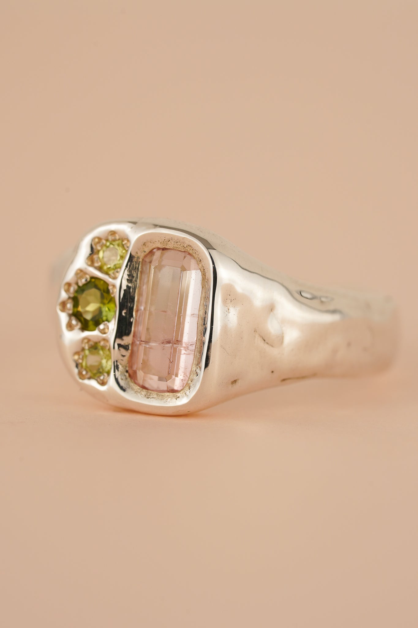 This molten signet ring holds a stunning pink tourmaline & three green peridot.