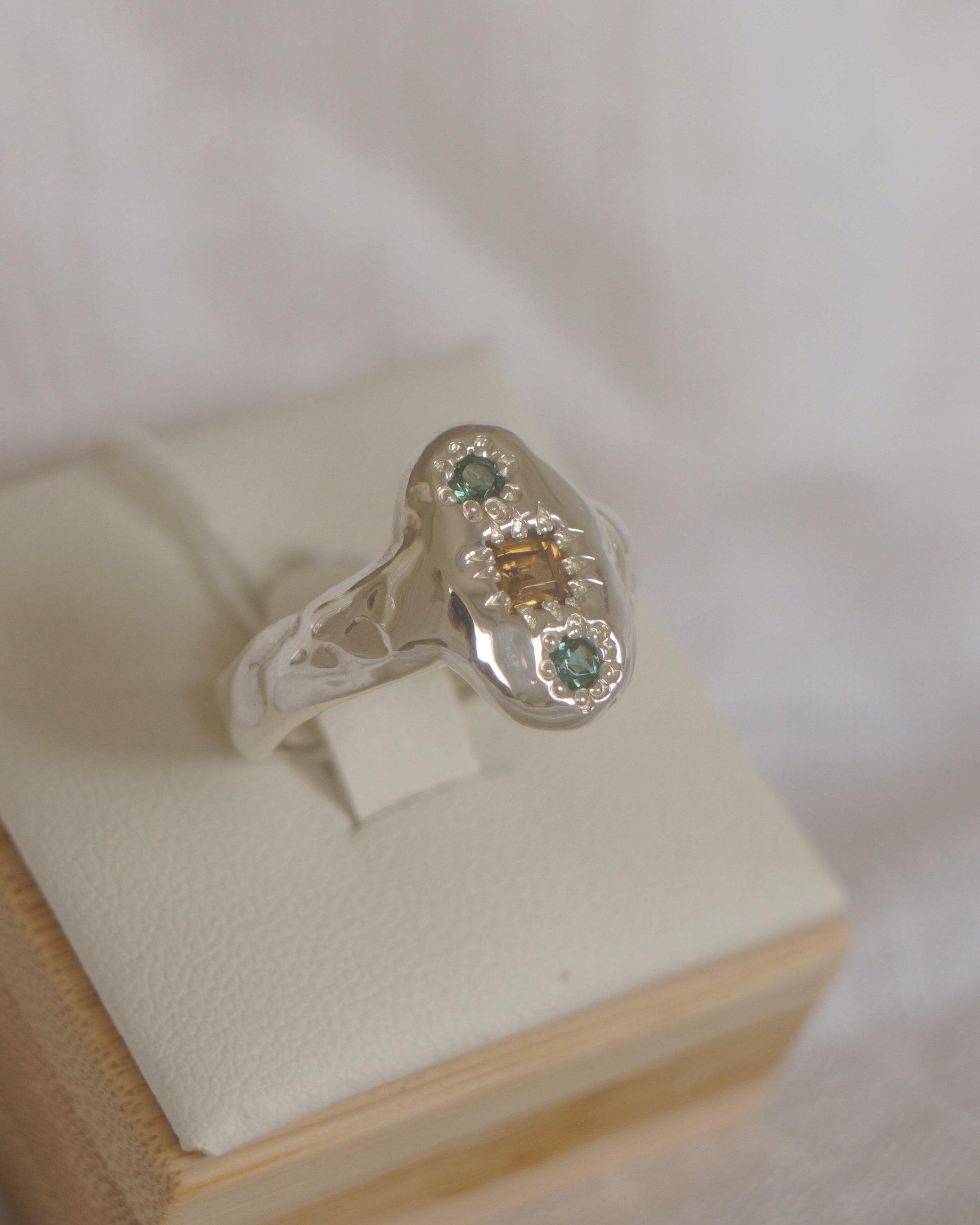 This solid sterling silver ring features a natural brown Australian zircon & two natural teal tourmaline gemstones. The ring was handmade using the lost wax casting method to create a molten texture.